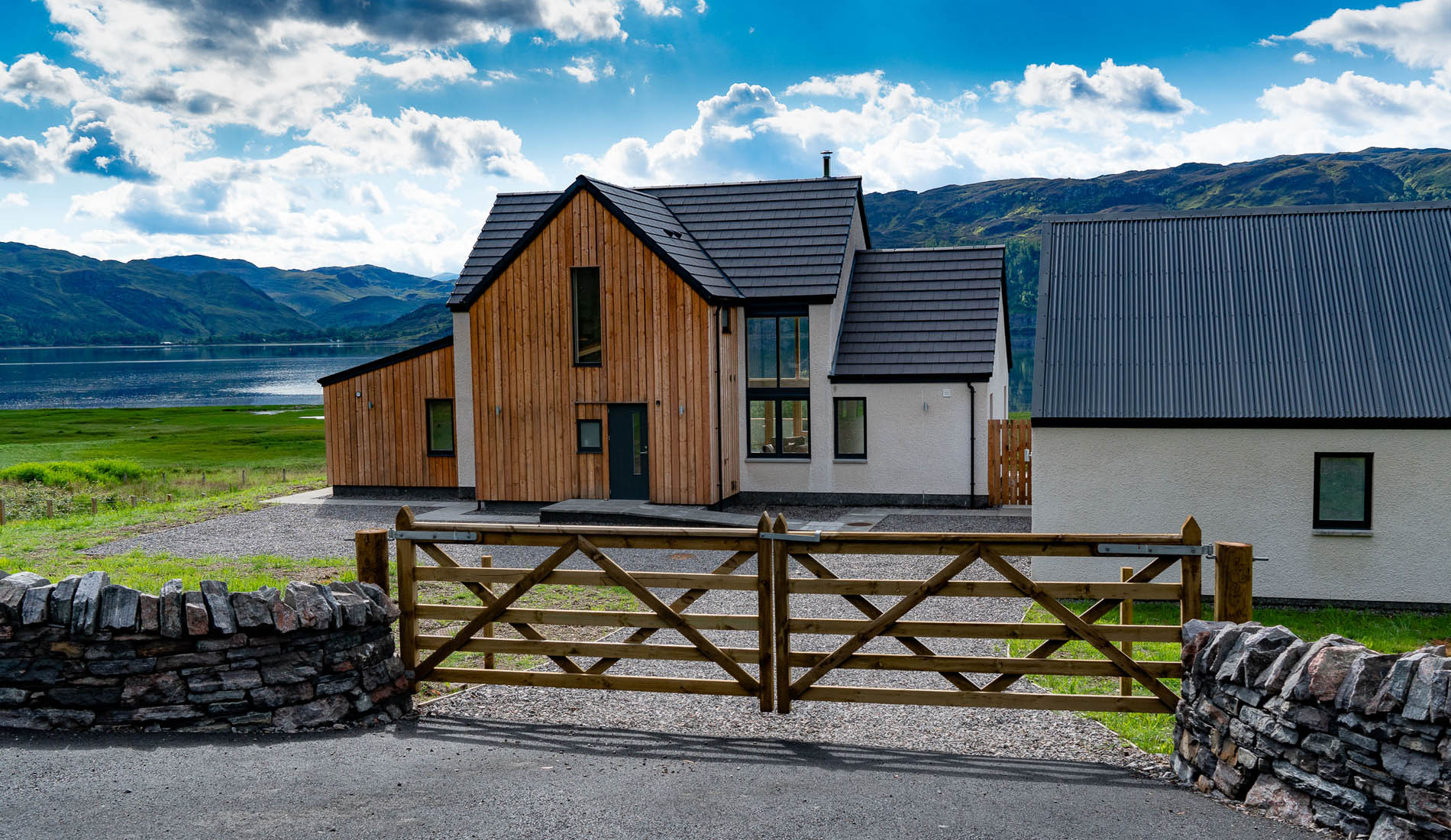 The house is located on a quiet side road off the main thoroughfare through Lochcarron village, itself an important waypoint on the now famous North Coast 500. It is located between the side road and the sea with uninterrupted views over Slumbay Harbour and towards Attadale on the far side of the Loch.